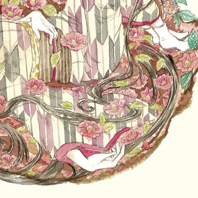 美しい花と乱れた黒髪——その組み合わせは、日本の怪異が持つ妖しい美しさそのものです。